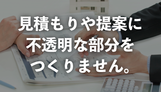 当社の見積もりは「一式」禁止。明朗会計でお作りいたします。ご不明なことがあれば何なりと聞いてください。